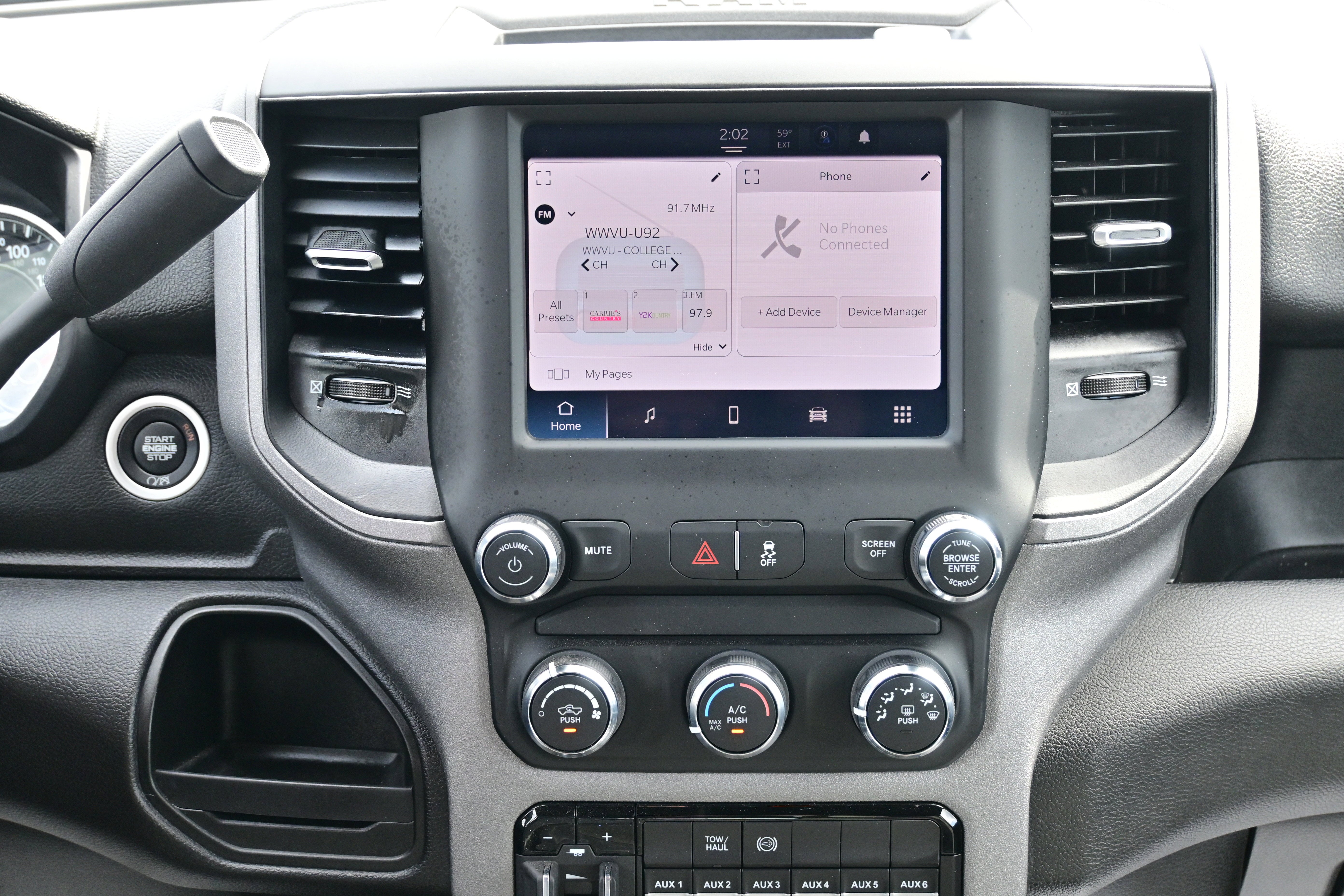Bed Utility Group (LED Bed Lighting, MOPAR Deployable Bed Step, and MOPAR Spray In Bedliner), Chrome Appearance Group (Bright Front Bumper, Bright Rear Bumper, Center Hub, Chrome Grille Surround, Chrome Headlamp Bezels, Matte Black Mesh Grille w/Chrome, and Wheels: 18" x 8.0" Steel Chrome Clad), Quick Order Package 2HA Tradesman, Snow Chief Group (Anti-Spin Differential Rear Axle, Auxiliary Switches Prep, Clearance Lamps, Dash Pass Thru Wire Circuits, and I/P Mounted Auxiliary Switches), Tradesman Level 2 Equipment Group (2 Way Rear Headrest Seat, 4 Way Front Headrests, 40/20/40 Split Bench Seat, Black Exterior Mirrors, Cloth 40/20/40 Bench Seat, Exterior Mirrors Courtesy Lamps, Exterior Mirrors w/Heating Element, Exterior Mirrors w/Supplemental Signals, For More Info, Call 800-643-2112, Front Armrest w/Cupholders, Manual Adjust 4-Way Driver Seat, Manual Adjust 4-Way Front Passenger Seat, Manual Folding Exterior Mirrors, Manual Telescoping Mirrors, Mirror Running Lights, Power Adjust Mirrors, Power Adjustable Convex Aux Mirrors, Power Heated Folding Telescope Mirrors, Rear Folding Seat, Rear Power Sliding Window, Rear Window Defroster, Remote USB Port - Charge Only, SiriusXM Radio Service, SiriusXM Satellite Radio, and Storage Tray), 17" x 7.5" Steel Styled Wheels, 220 Amp Alternator, 3.73 Axle Ratio, 4-Wheel Disc Brakes, 4G LTE Wi-Fi Hot Spot, 5th Wheel/Gooseneck Towing Prep Group, 6 Speakers, 8.4" Touchscreen Display, ABS brakes, Active Noise Control System, Air Conditioning, All R1 Low Radios, All Radio Equipped Vehicles, AM/FM radio, Apple CarPlay, Auto Power-Folding Mirrors, Bluetooth® Handsfree Phone & Audio, Brake assist, Compass, Connectivity - US/Canada, CTR Stop Lamp w/Cargo View Camera, Delay-off headlights, Driver door bin, Dual Alternators Rated At 440 Amps, Dual front impact airbags, Dual front side impact airbags, Electronic Stability Control, Electronically Controlled Throttle, Emergency communication system: SiriusXM Guardian, For Details, Visit DriveUconnect.com, Forward & Reverse Utility Lights, Front anti-roll bar, Front Center Armrest w/Storage, Front reading lights, Fully automatic headlights, Global Telematics Box Module (TBM), Google Android Auto, GPS Antenna Input, Heavy Duty Vinyl 40/20/40 Split Bench Seat, Illuminated entry, Integrated Center Stack Radio, Integrated Voice Command w/Bluetooth®, Low tire pressure warning, MOPAR Front & Rear Rubber Floor Mats, Occupant sensing airbag, Outside temperature display, Overhead airbag, Overhead console, ParkView Rear Back-Up Camera, Passenger door bin, Passenger vanity mirror, Power Heated Fold Telescope Mirrors, Power steering, Power Telescoping Mirrors, Power windows, Radio data system, Radio: Uconnect 3 w/5" Display, Radio: Uconnect 5 W w/8.4" Display, Rear anti-roll bar, Rear step bumper, Selectable Tire Fill Alert, Speed control, Tachometer, Tilt steering wheel, Tip Start, Tow Hooks, Traction control, Trailer Brake Control, Trailer Light Check, Variably intermittent wipers, and VoltmeteR.